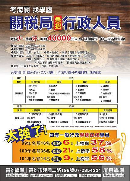 3行政法 4民法 5民事訴訟法與強制執行法 ◎6英文 7關稅法規 |